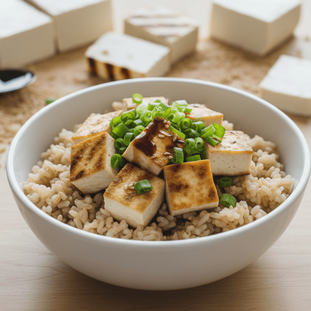 현미의 갈색빛 위에 두부의 하얀색이 조화를 이루며